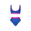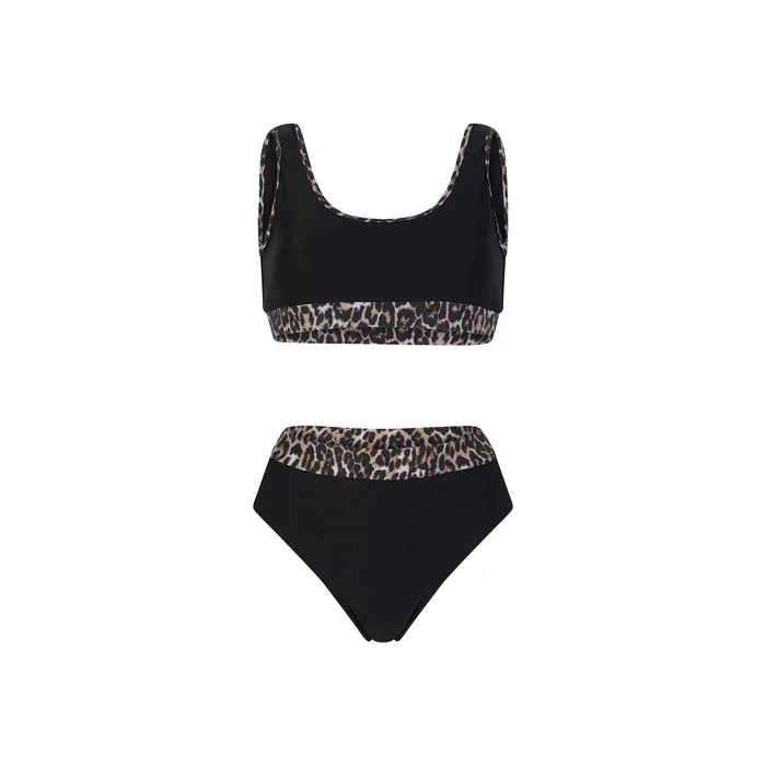בגדי ים שני חלקים בגזרה ספורטיבית בשלושה צבעים כחול ורוד, שחור לבן ומנומר.