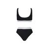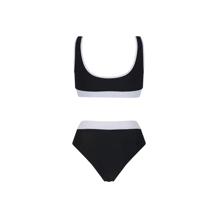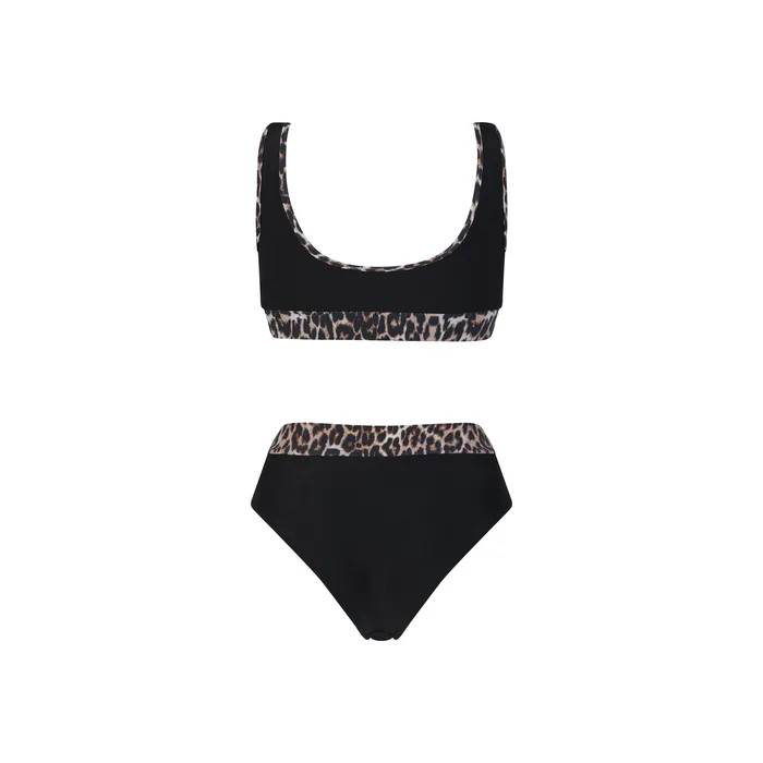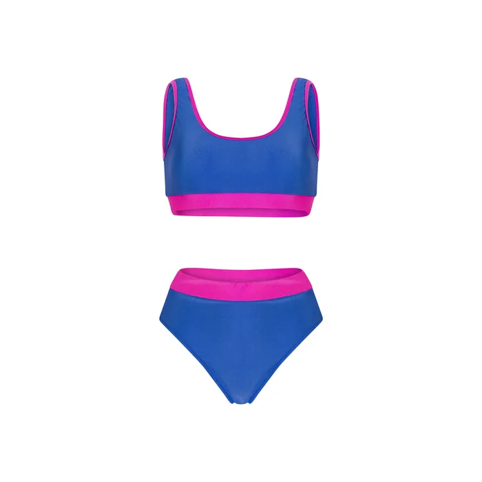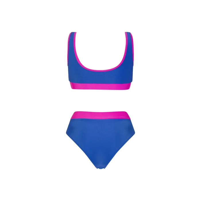 בגדי ים שני חלקים בגזרה ספורטיבית בשלושה צבעים כחול ורוד, שחור לבן ומנומר.